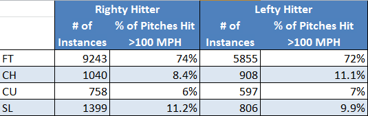 Both handed hitters comparatively prefer the balls that would traditionally break away from from as a right handed pitcher. Lefties hit all changeups about 3% more often above 100 mph than their right handed counterparts. Meanwhile, righties hit sliders about 2% more often above 100 mph than their left handed counterpart.