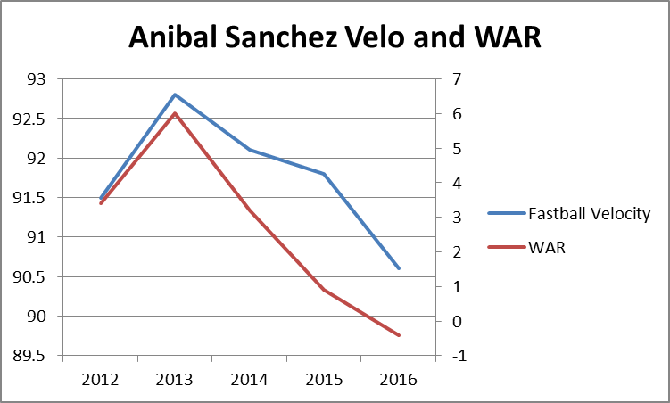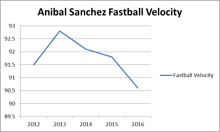 It’s that simple for Anibal Sanchez. He’s lost his velocity over the last three years, in large part due to injury, but also likely because he’s 32 and has been in pro ball since he was 17. 2016 appears to be a bit of a double whammy for him too. Not only is he throwing out a career worst average fastball velocity, but he’s also walking people at the highest clip since he was 25. Sanchez sports a 6.67 ERA and hasn’t gotten through an outing this year without surrendering multiple earned runs.