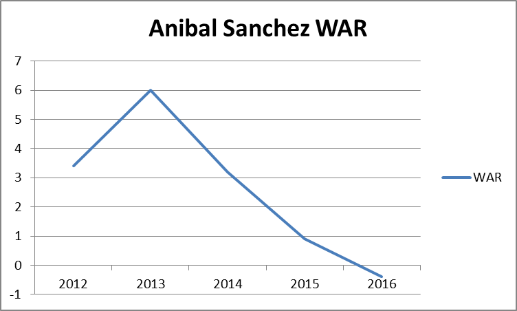 It’s that simple for Anibal Sanchez. He’s lost his velocity over the last three years, in large part due to injury, but also likely because he’s 32 and has been in pro ball since he was 17. 2016 appears to be a bit of a double whammy for him too. Not only is he throwing out a career worst average fastball velocity, but he’s also walking people at the highest clip since he was 25. Sanchez sports a 6.67 ERA and hasn’t gotten through an outing this year without surrendering multiple earned runs.