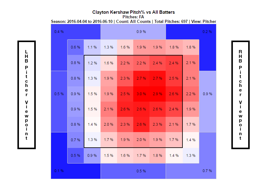 To wrap up, I’d also like to expand on the heat map included in the ESPN article. An appropriate investigation as to the effectiveness of his slider starts with looking at a representation of his primary pitch: the fastball. Take this heat map (below) and compare it to the one provided of his slider and we notice right away that Kershaw likes to pitch on the inner-third to righties, or outer-third for left-handed batters.