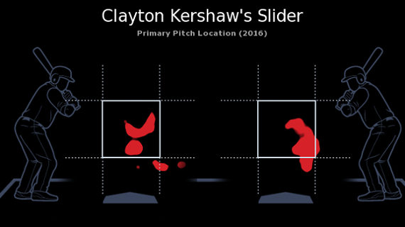 For the final insight to Clayton Kershaw’s dominance, I derived inspiration from an informative article from ESPN Stats and Information on his beastly secondary pitch: the slider. (Warning: things are about to get GIF-y). With the well-known absurdity that is the Kershaw curve (one more for good luck) and his A+ fastball, and occasionally something special, he hardly needs a dominant slider at all. As the heat map below shows, Kershaw has been burying his slider all season.
