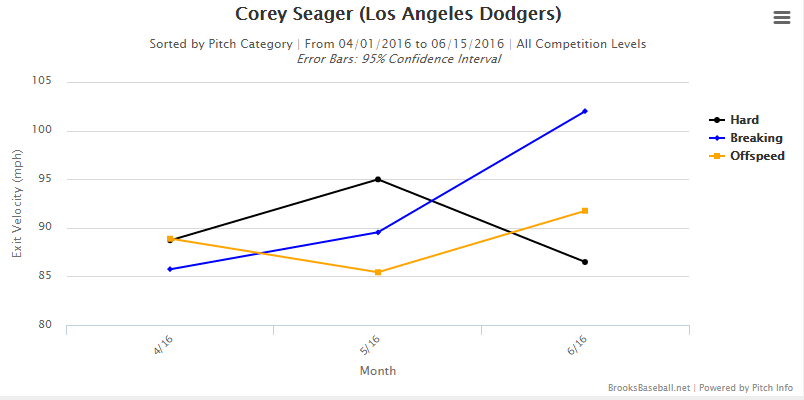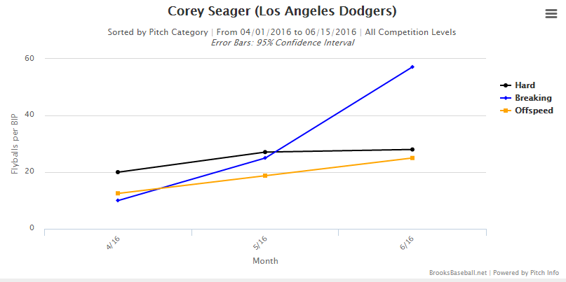 These graphs show Corey Seager’s month to month batted ball exit velocities as well as his percentage of fly balls per ball put in play, again broken down by pitch type. Ignoring fastballs, Seager has greatly increased the exit velocity on breaking pitches and offspeed pitches each month this season. Simultaneously, he has been putting far more balls in the air than he was in April, specifically on breaking balls.