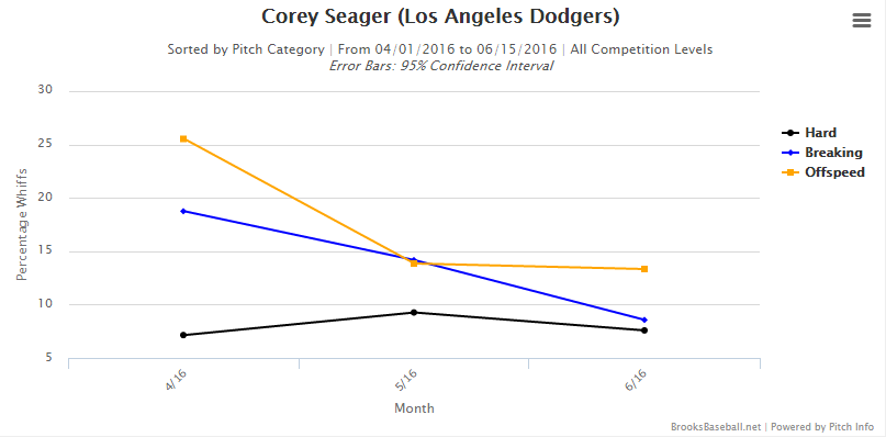 This first graph shows the percentage of swings and misses by Seager from month to month in 2016, broken down by pitch type. As you can see, April saw Seager swing and miss a good amount on breaking pitches, and a whole lot more on offspeed pitches. As a result, pitchers began throwing more offspeed and breaking stuff to him, jumping from 36.18% in April to 41.47% by May. But Seager adjusted rather quickly, decreasing his whiff rates on those pitches dramatically from April to now. As a result, the number of breaking and offspeed pitches seen by Seager has dropped back down to 31.80% in June. Now look at the next two graphs to see just how significant these improvements have been: