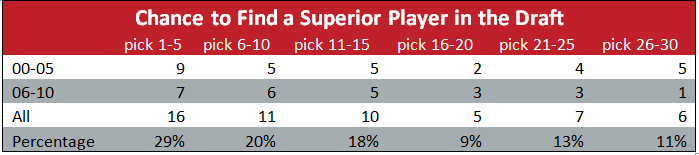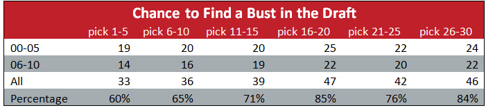 Next, let’s look at the chance to find a successful player, as we defined it earlier, in the first round of the draft.