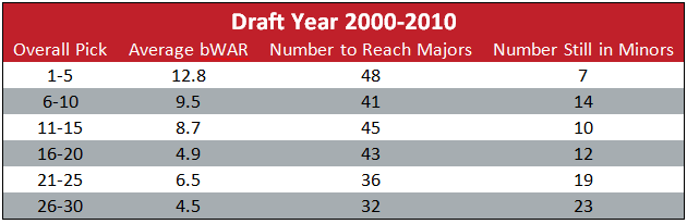A few things jump out from the chart above. Of the 55 players selected in the top 5 between 2000 and 2010, 48 reached the major leagues. That seems like a really good rate. Teams were able to more or less successfully identify the best 5 players available in a given draft. Of course, there’s probably some bias here as teams are more likely to promote players they took at the very top of the draft to save face, even if they might not be perfectly qualified.
