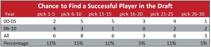 Next, let’s look at the chance to find a successful player, as we defined it earlier, in the first round of the draft.