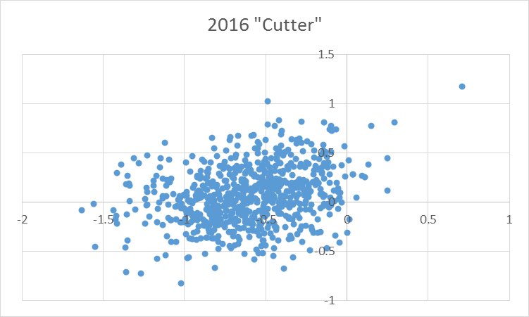 It’s his two seamer where people are doing the most damage; they’re hitting his two seam fastball at a 236 wRC+. That’s 136% better than average. They didn’t do that last year, but batters also crushed his two seam in 2015 (168 wRC+). So, what gives? Theory: the cutter keeps batters off of the two seam. In 2015, his cutter pitch did only have a downward movement of -0.2. He enhanced that and got batters out more efficiently with his two seam. This year, the two seam is the same but the cutter pitch now moves more similarly to that two seam.