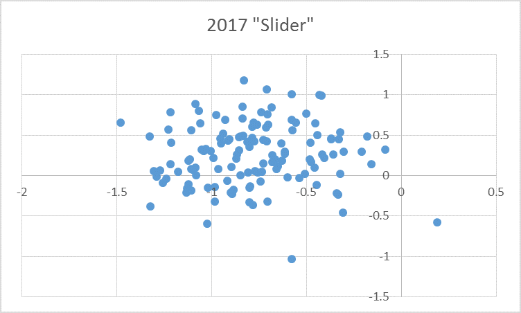 However, Fangraphs appears to have changed the classification of his cutter to “slider.” It’s still the same 85 mph, but the movement on the pitch is different. Check out the below.