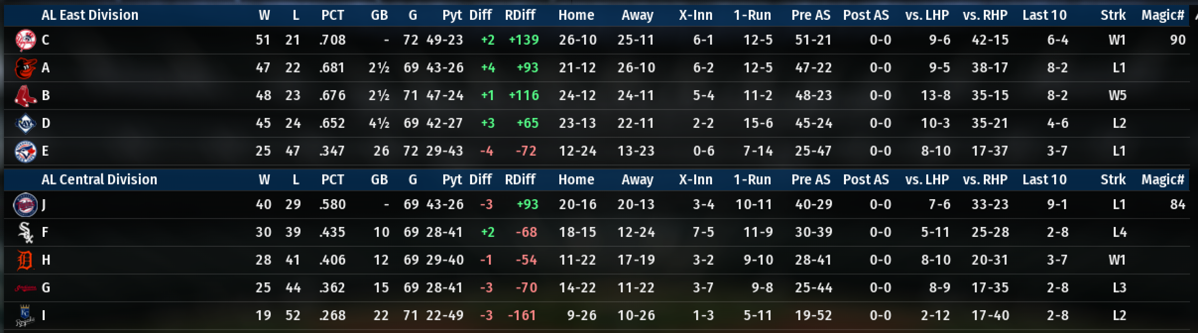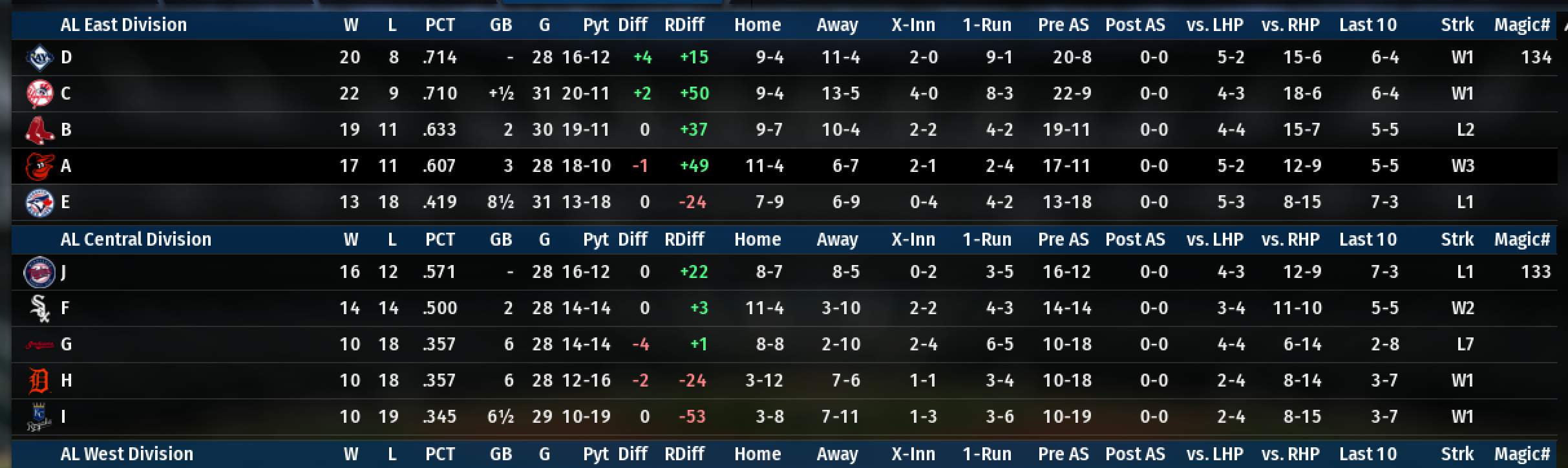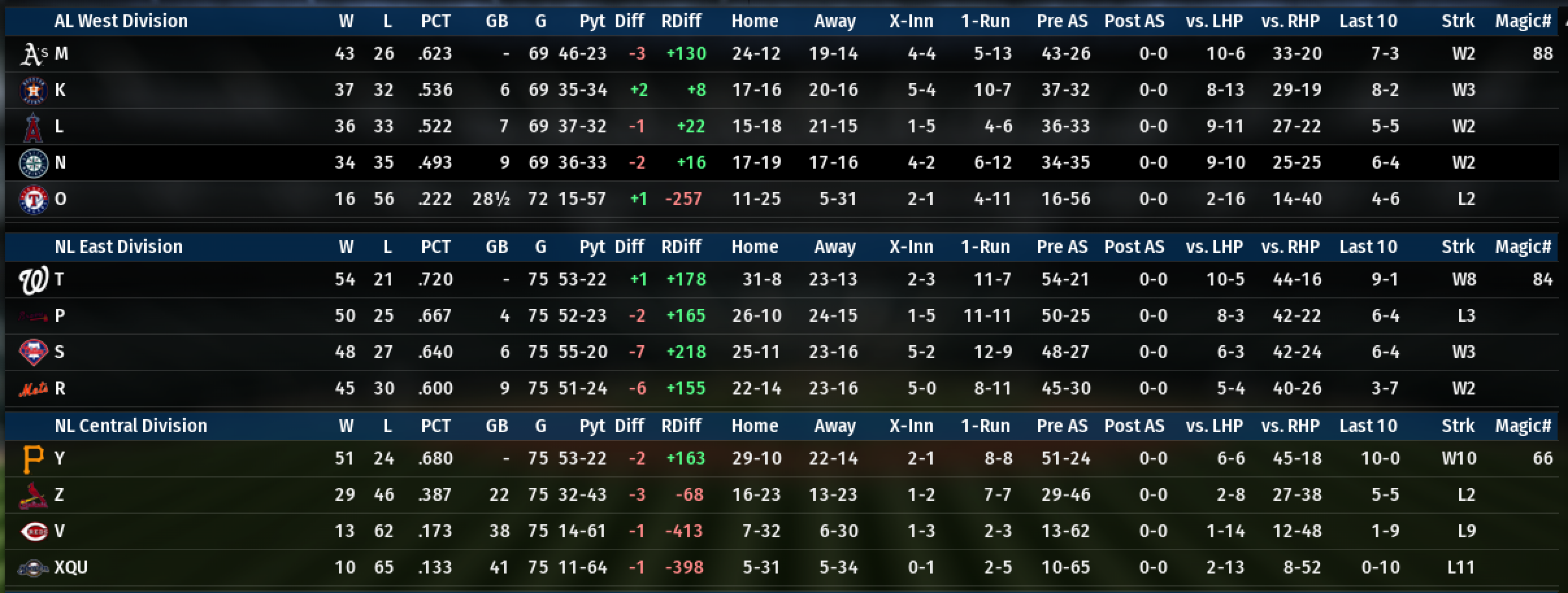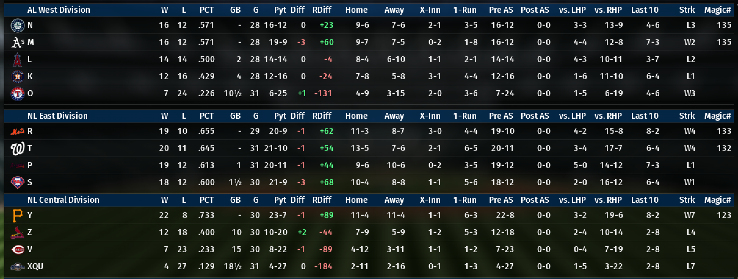 It’s already clear that league organization has played a big role in teams’ success. R, for instance, has been totally screwed by playing in the same division as T, P, and S, and is in last place despite a .600 winning percentage. On the other hand, J is 10 games up on their division with just a .580 winning percentage. NL teams appear to have bloated win totals because they can beat up on XQU and V so often. It’s definitely a flaw in the sim.