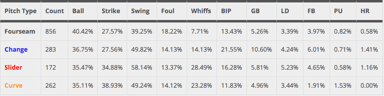 Last season he leaned heavily on his changeup (21.1%) and slider (13.5%) which only have an 8 MPH differential with his fastball while his curveball has a differential of 15 MPH. Now that he has more confidence in his curveball, he is figuring out how to keep hitters off balance. His curveball has become his best pitch, he is throwing it for strikes and limiting damage. The chart below (from Brooksbaseball.net) shows his performance per pitch type so far this season.