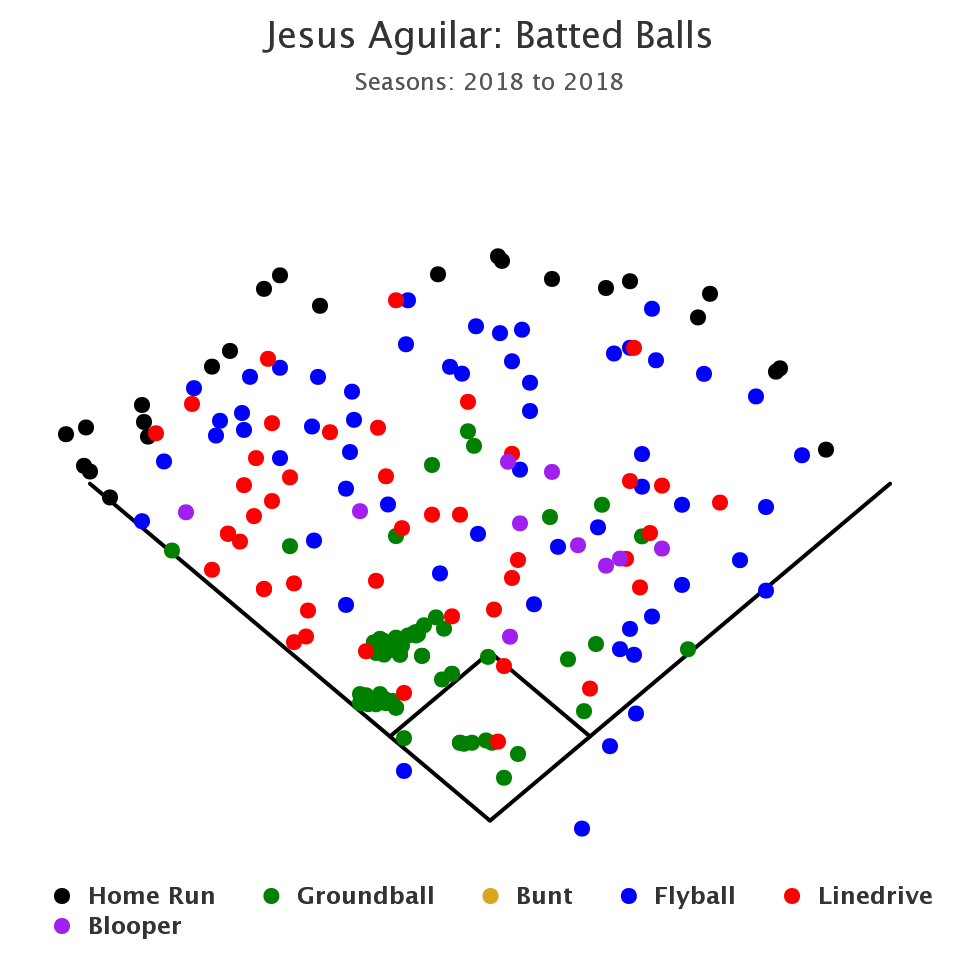The advanced stats show some insight as to why Aguilar is building on the minor success he saw last season and experiencing a breakout this season. is hard, medium, soft hit percentage are virtually the same as last season, 46.3%, 39.5%, and 14.2%, respectively.