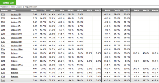 He spent the first eight years of his career in the Indians farm system slowly making his way through the organization, debuting in 2014. He didn’t see much time in the bigs as he bounced between the majors and minors from 2014 and 2016, only amassing 64 PA for the Indians. He was released after 2016, a year in which he led Triple-A in home runs with 30. The Brewers picked him up as a potential back up to newly signed KBO superstar, Eric Thames. Given that he was a backup, he only had 311 PA in 2017. But man did he show a knack for hitting the ball far with 16 home runs and 52 RBI.